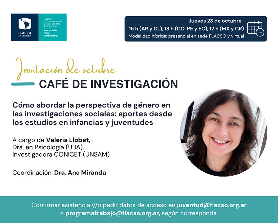 El jueves 23 de octubre a las 15.00h (hora argentina), el Programa Estudios de Juventud de FLACSO Argentina invita a participar de una nueva edición del Café de Investigación, un espacio de intercambio académico que combina la investigación con el debate abierto.