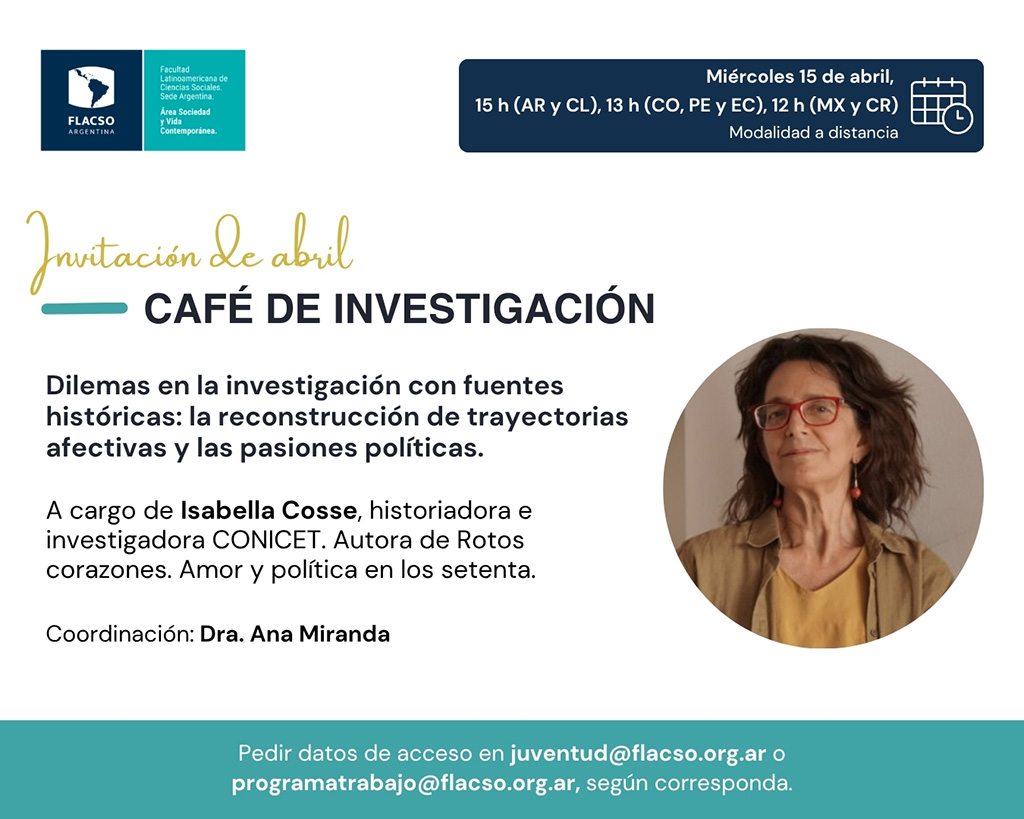En esta ocasión, el encuentro titulado “Dilemas en la investigación con fuentes históricas: la reconstrucción de trayectorias afectivas y las pasiones políticas”, estará a cargo de Isabella Cosse, historiadora e investigadora del CONICET. Autora de Rotos corazones. Amor y política en los setenta. La Dra. Ana Miranda, investigadora de FLACSO Argentina, tendrá a su cargo la coordinación.