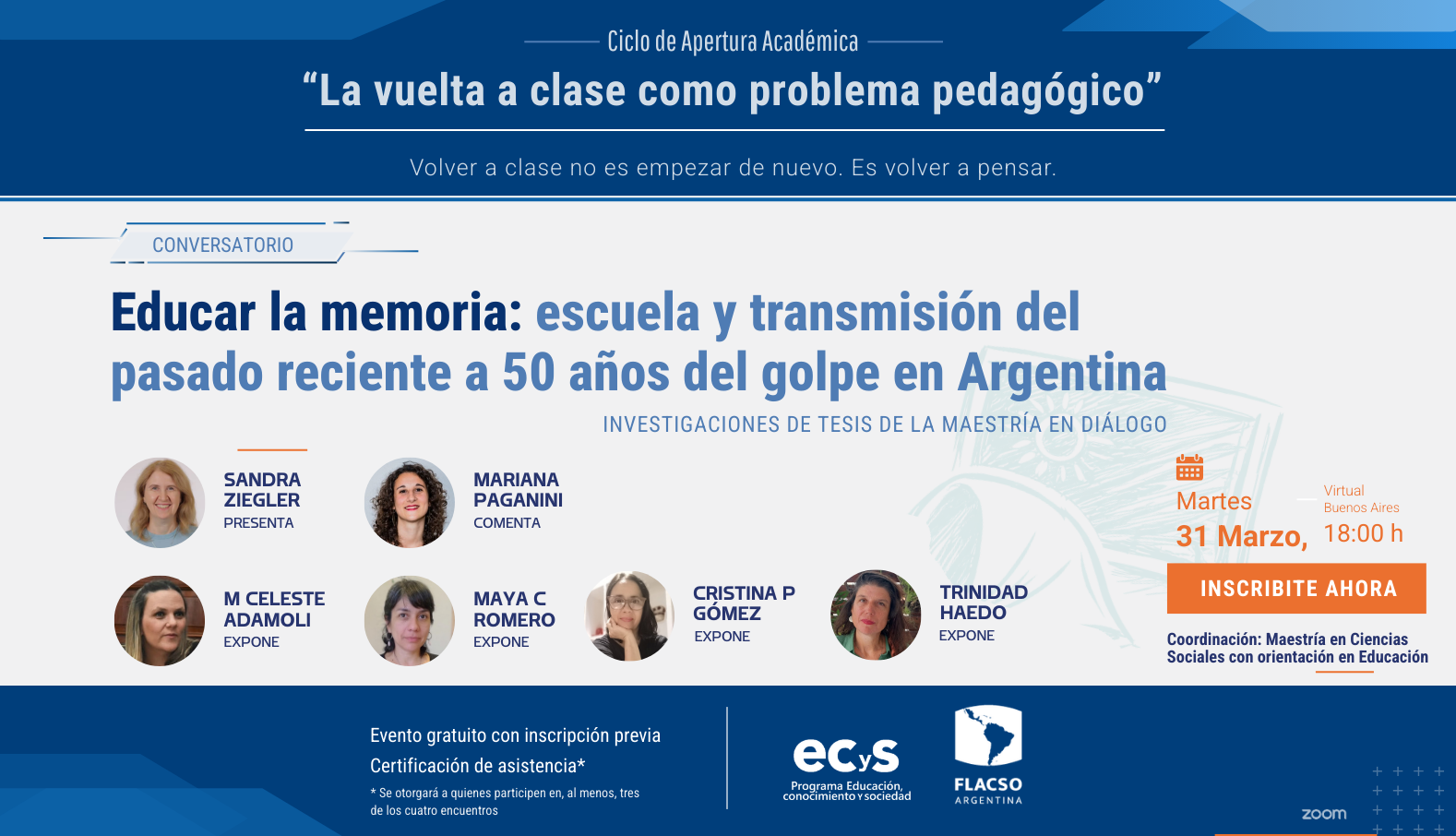 En el marco de sus actividades académicas, el Programa Educación, Conocimiento y Sociedad (ECyS) del Área Educación de FLACSO Argentina invita a participar del conversatorio “Educar la memoria: escuela y transmisión del pasado reciente a 50 años del golpe en Argentina. Investigaciones de tesis de la Maestría en diálogo”, coordinado por la Maestría en Ciencias Sociales con orientación en Educación.