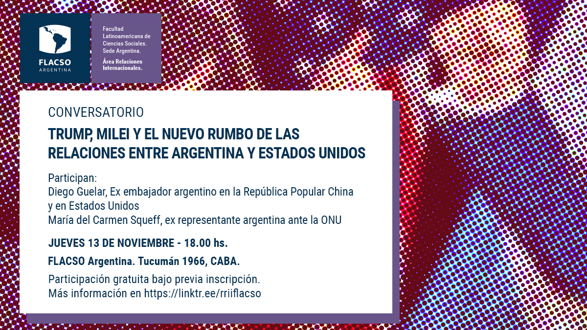 El Área de Relaciones Internacionales de FLACSO Argentina invita al Conversatorio “Trump, Milei y el nuevo rumbo de las relaciones entre Argentina y Estados Unidos”. El mismo se llevará a cabo el jueves 13 de noviembre a las 18.00 hs. en la sede de FLACSO (Tucumán 1966, CABA).