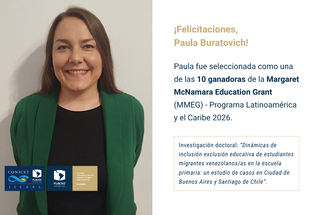 Felicitamos a Paula Buratovich, estudiante del Doctorado de la FLACSO, becaria del IICSAL (CONICET-FLACSO) y miembro del Grupo de Estudio sobre Ciudadanía, Transición Educativa y Convivencia (GECITEC-PLySE) por haber sido seleccionada como una de las diez ganadoras de la Margaret McNamara Education Grant (MMEG) – Programa Latinoamérica y el Caribe 2026. [Leer +] |