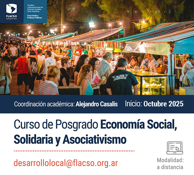 El curso de posgrado “Economía social y solidaria y asociativismo” (a distancia), forma parte del Diploma Superior en “Desarrollo local, territorial y economía social” (a distancia). Cuenta con la participación de prestigiosos docentes y especialistas con experiencia en la gestión pública y en economía social, solidaria y popular, como así también de funcionarios y actores sociales invitados.