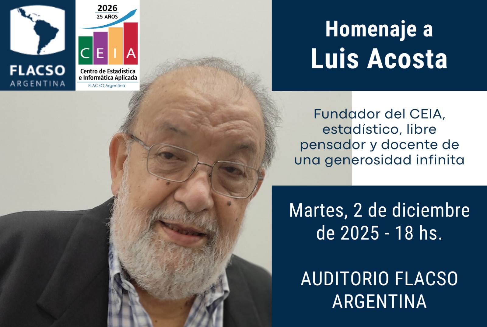 El Centro de Estadística e Informática Aplicada (CEIA) de FLACSO Argentina organiza un homenaje a su fundador, el Profesor Luis Acosta, en reconocimiento a su destacada labor, su trayectoria docente en el ámbito de las Ciencias Sociales y su imborrable legado humano.