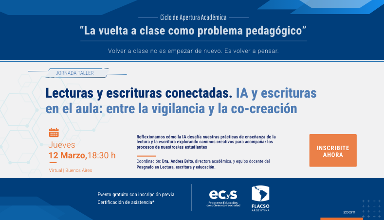 En el marco de sus actividades académicas, el Programa Educación, Conocimiento y Sociedad (ECyS), Área Educación de FLACSO Argentina, invita a participar de la jornada taller “Lecturas y escrituras conectadas. IA y escrituras en el aula: entre la vigilancia y la co-creación”, coordinada por la Dra. Andrea Brito, directora académica, junto al equipo docente del Posgrado en Lectura, Escritura y Educación.