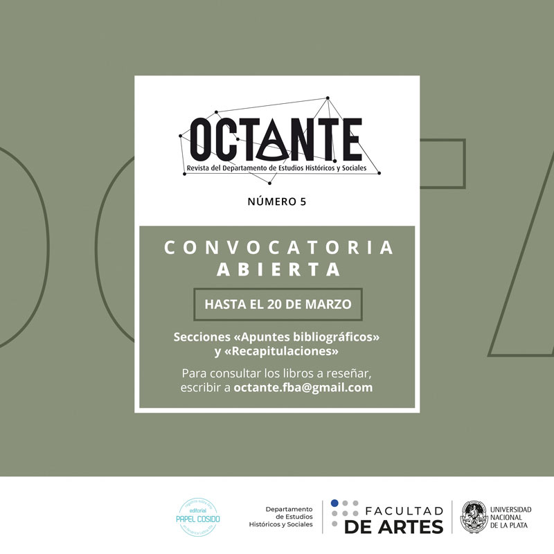 Octante es una revista electrónica, anual y arbitrada, con alcance nacional e internacional, que tiene por objetivo la publicación de textos inéditos sobre los diferentes enfoques que se desprenden de las distintas disciplinas y perspectivas epistemológicas que se nuclean en el Departamento de Estudios Históricos y Sociales de la Facultad de Artes de la UNLP.