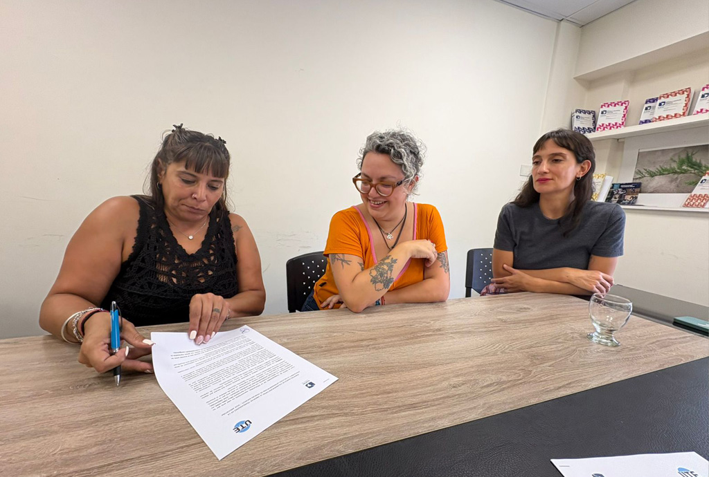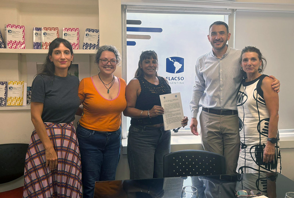 La firma del convenio se realizó con la presencia de Valentina Delich, directora de FLACSO Argentina; Monona Gutiérrez, secretaria general de UTE; Antonella Bianco, secretaria de Igualdad de Oportunidades y Géneros de UTE; Paula Galigniana, secretaria de Comunicación de UTE; y por el equipo del NEGESEC Sebastián Fuentes y Natalia Nasep.