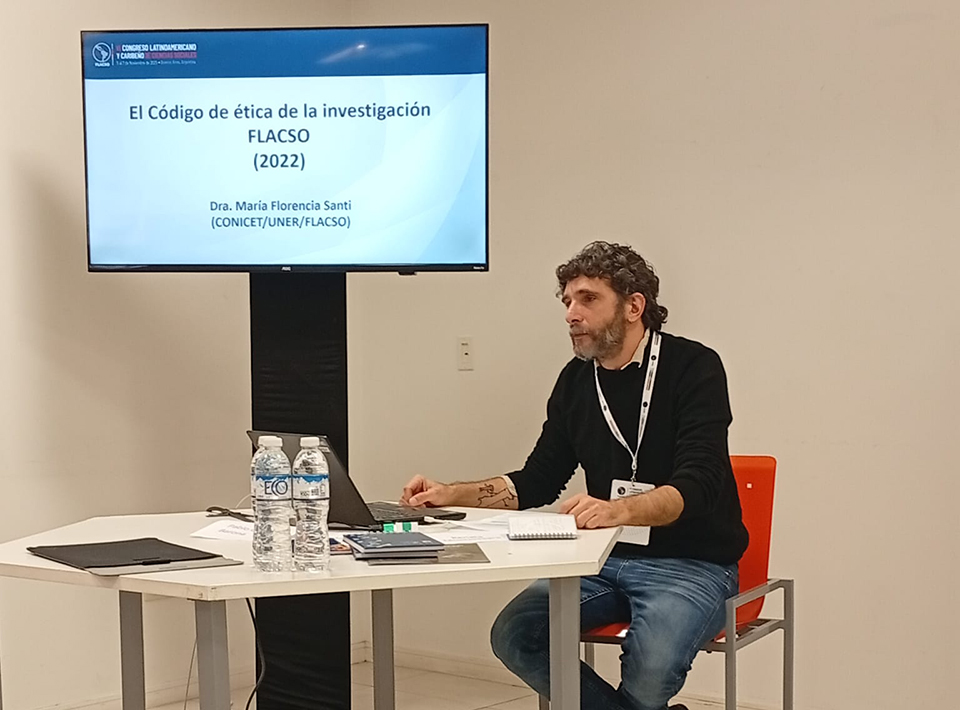 Por último, Facundo García Valverde relató la experiencia de María Florencia Santi en la redacción del Código de ética de la sede central de FLACSO Regional durante el año 2022 donde se priorizó la visibilización de las cuestiones éticas que pueden surgir en la realización de investigaciones sociales. A su vez, comentó García Valverde, cómo se buscó fortalecer la integridad científica en determinados principios y pautas de este código para que sean comprendidos como guías para la planificación, diseño, realización y publicación de investigaciones sociales con seres humanos en todo el ciclo de la investigación.