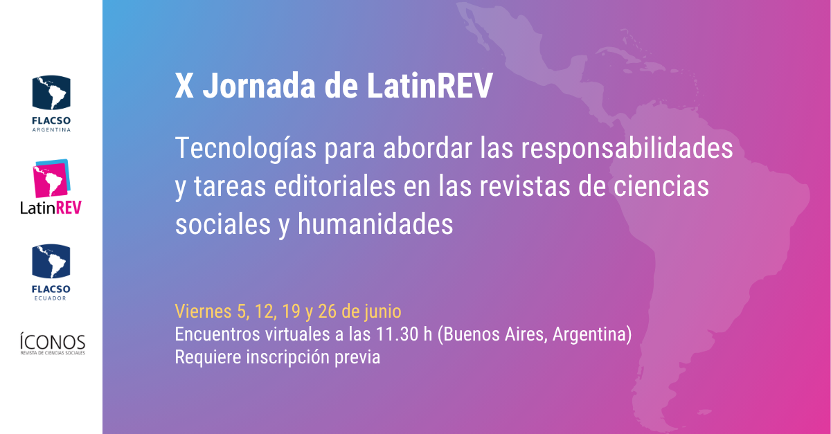 Del 5 de junio al 26 de junio de 2026 se realizará la décima edición de la Jornada LatinREV, evento muy esperado por quienes participan de la red y de los equipos editoriales de las más de 2.900 revistas que actualmente la conforman. En esta ocasión el lema convocante es “Tecnologías para abordar las responsabilidades y tareas editoriales en las revistas de ciencias sociales y humanidades”. Es una actividad académica organizada por el Área de Estado y Políticas Públicas y la Biblioteca de Ciencias Sociales “Enzo Faletto” de la FLACSO Argentina. Tal como se hizo en 2019 y en las últimas jornadas de 2024 y 2025, se acordó con la FLACSO Sede Académica de Ecuador para realizar una co-organización. Dicha sede cuenta con un área de soporte tecnológico de envergadura y calidad, y con la prestigiosa revista “Íconos”, la cual participa desde los inicios de LatinREV.