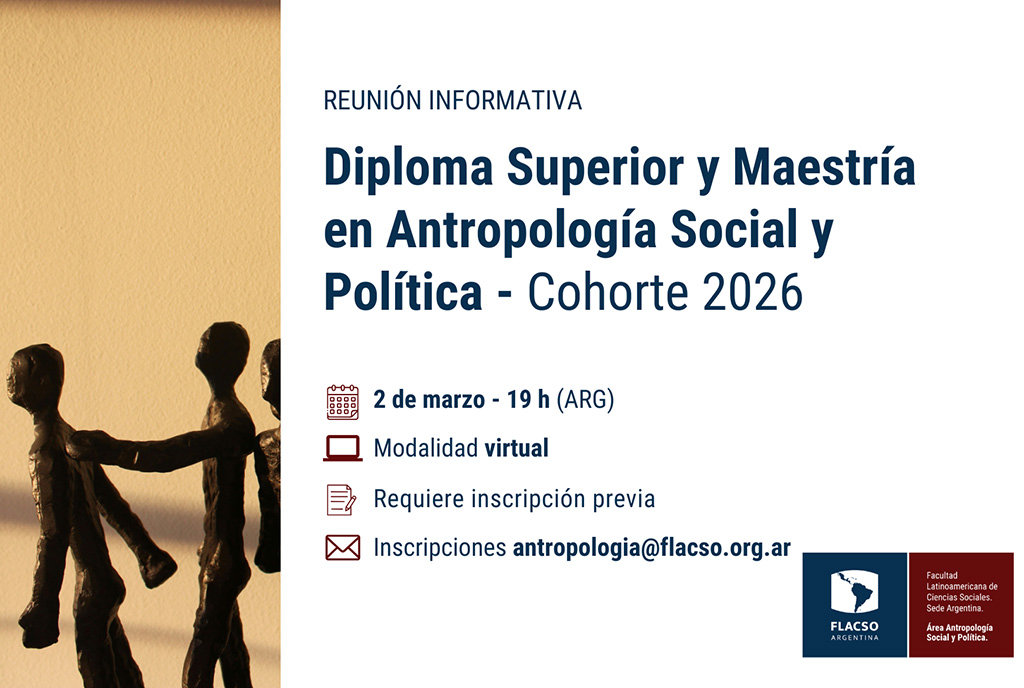 El Área de Antropología Social y Política de la FLACSO Argentina, invita a una reunión informativa para interesados/as y aspirantes a ingresar a la Cohorte 2026-2027 de la Maestría y el Diploma Superior en Antropología Social y Política. El encuentro se llevará a cabo el lunes 2 de marzo a las 19.00 h (hora argentina).