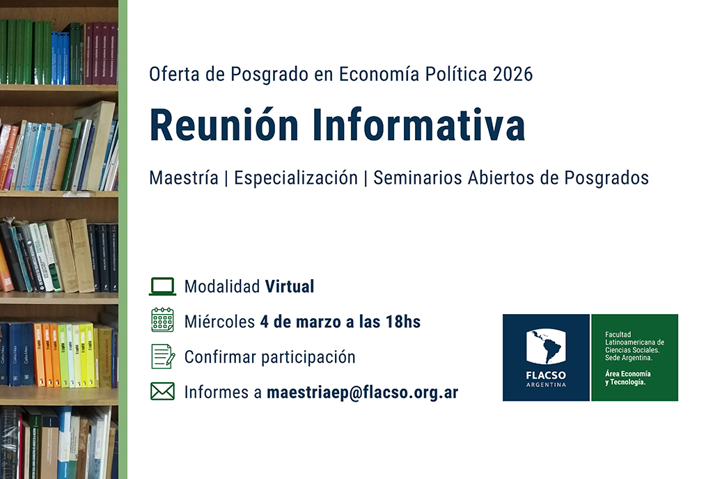 El Área de Economía y Tecnología de la FLACSO Argentina invita a una charla informativa dirigida a personas interesadas en cursar sus SEMINARIOS ABIERTOS DE POSGRADO 2026 (trimestrales, con inicio en marzo, junio y septiembre). Esta actividad se llevará a cabo de manera virtual a través de la plataforma Zoom el miércoles 4 de marzo a las 18.00 (hora argentina).