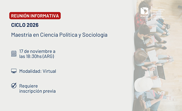 El Área de Estudios Políticos y Sociales de FLACSO Argentina invita a participar de la reunión informativa para el ciclo 2026 de la Maestría en Ciencia Política y Sociología. La convocatoria está dirigida a todas las personas interesadas y aspirantes a ingresar al posgrado.