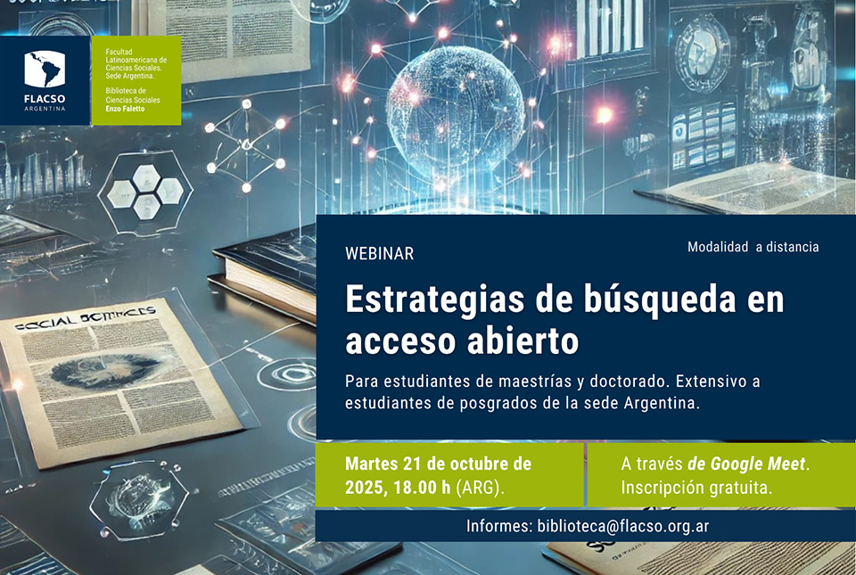 La Biblioteca de Ciencias Sociales “Enzo Faletto” de la FLACSO Argentina invita a participar del webinar “Estrategias de búsqueda en acceso abierto”, a cargo de María Cecilia Corda y Leonardo Javier Álvarez.
