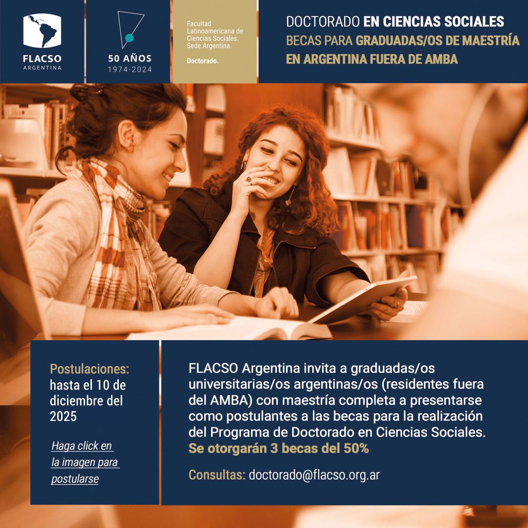 FLACSO Argentina invita a graduadas/os universitarias/os argentinas/os (residentes fuera del AMBA) con maestría completa a presentarse como postulantes a las becas para la realización del Programa de Doctorado en Ciencias Sociales, cuyo calendario académico comienza en mayo del 2026.