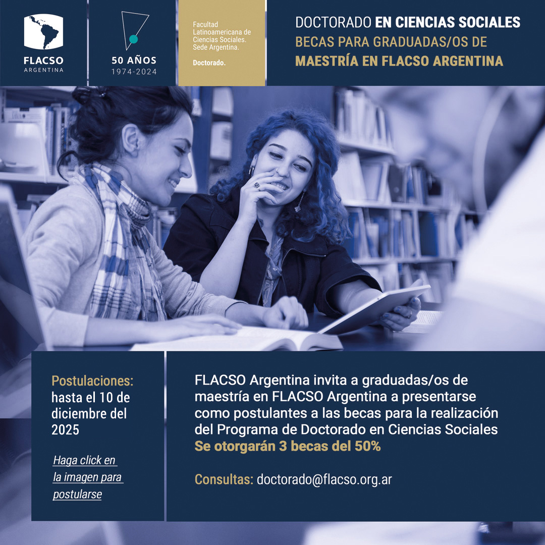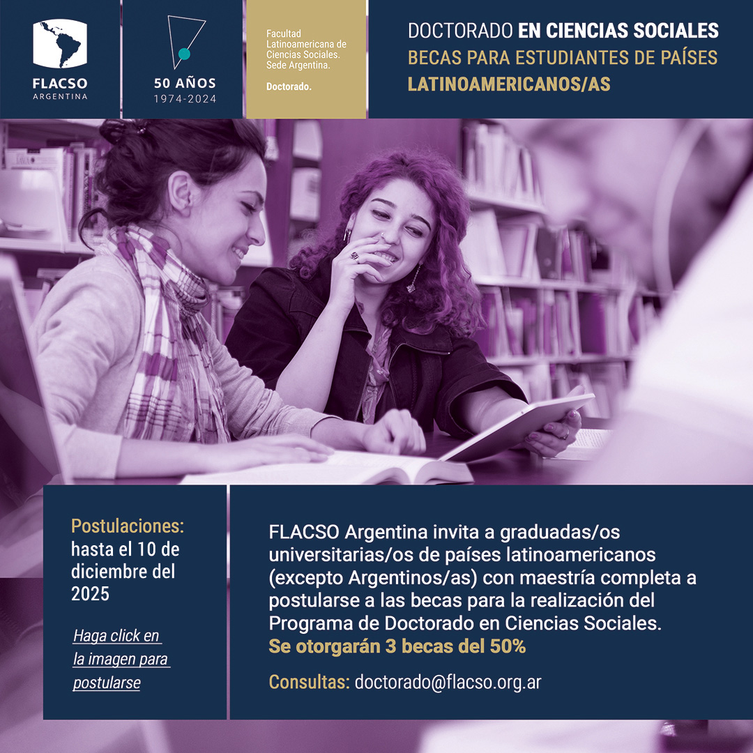 FLACSO Argentina invita a graduadas/os universitarias/os de países latinoamericanos (excepto argentinas/os) con maestría completa a presentarse como postulantes a las becas para la realización del Programa de Doctorado en Ciencias Sociales, cuyo calendario académico comienza en mayo del 2026.